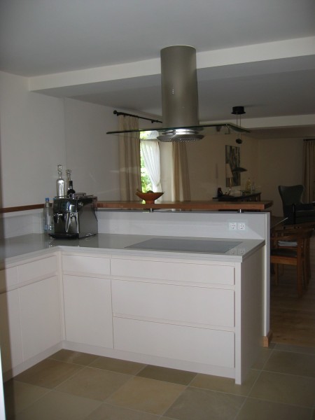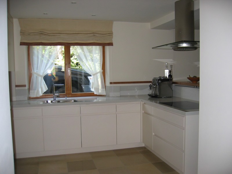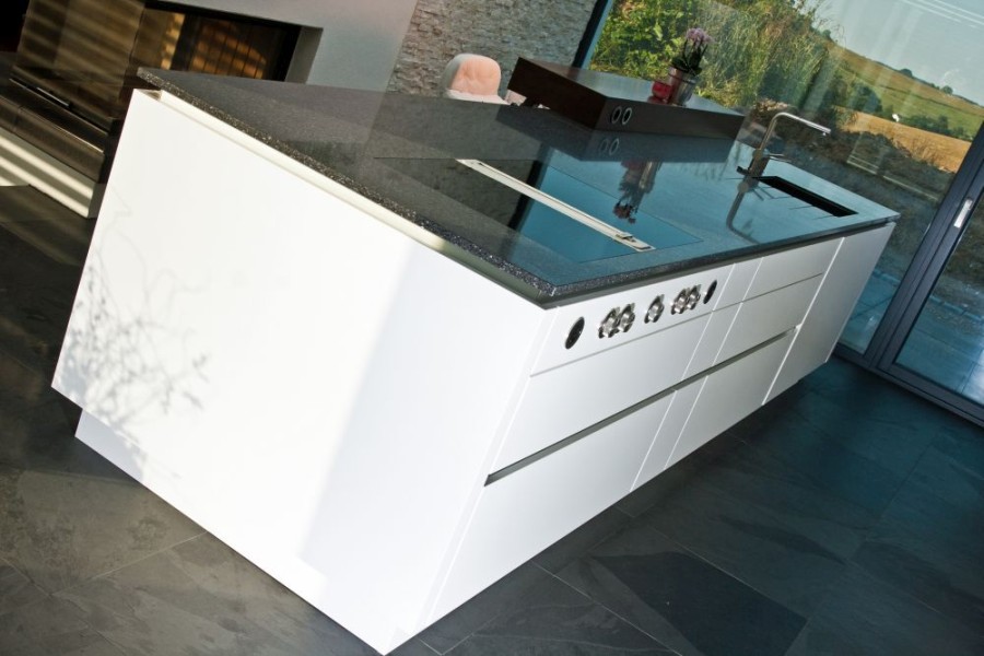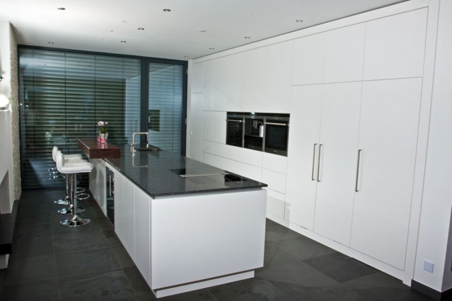 Luftige Küche in weiß Lack mit mattem Granit