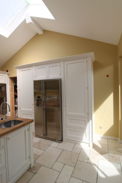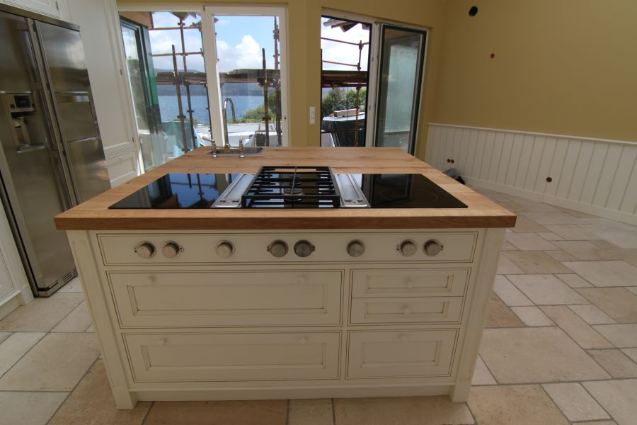 Englische Landhausküche in Massivholz, weiß lackiert und patiniert