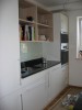 Grifflose Küche in weiß Lack mit Akzenten in Kirschbaum