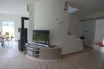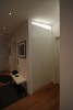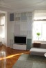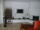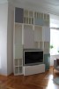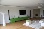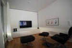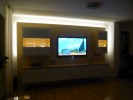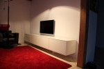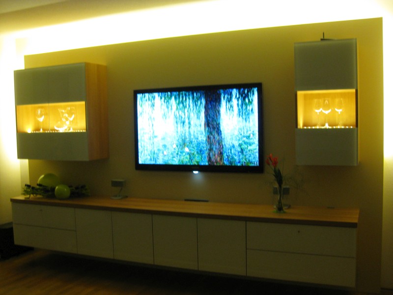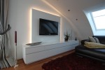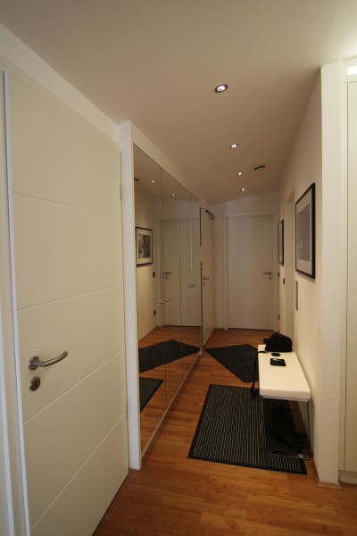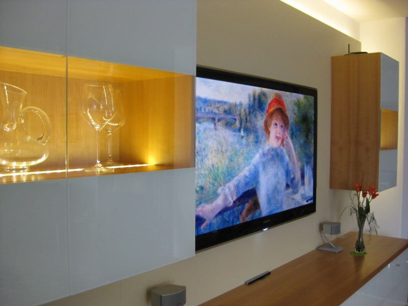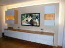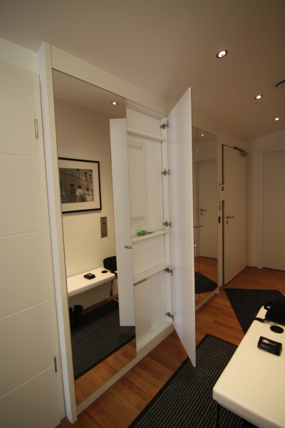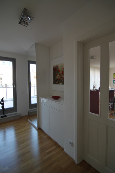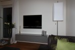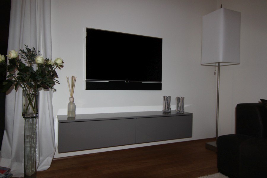Vorgesetzte TV-Wand mit Lowboard in hochglanz, Garderobe hinter Spiegelwand