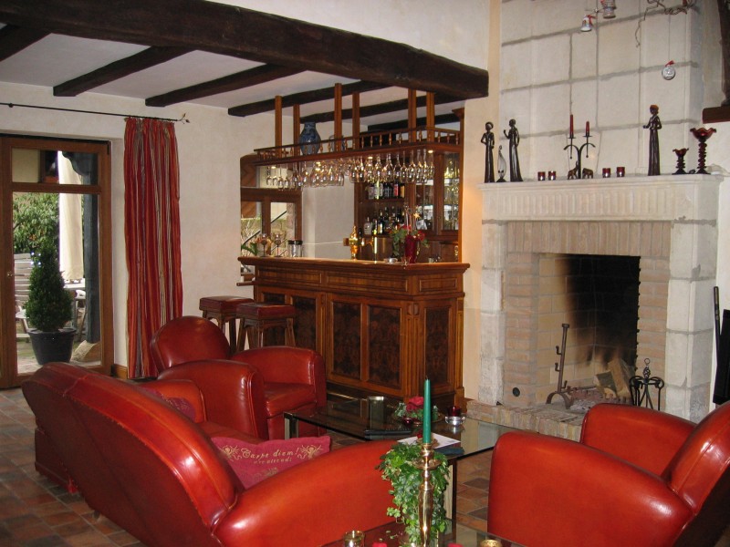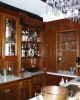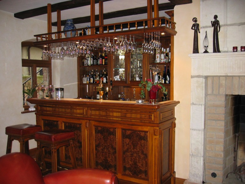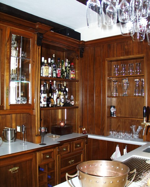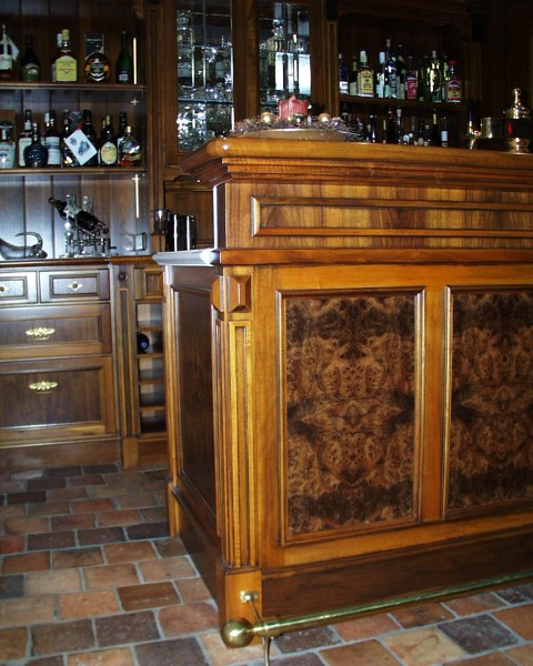 Lounge mit Bar in Nussbaum. Füllungen in Wurzelmaser
