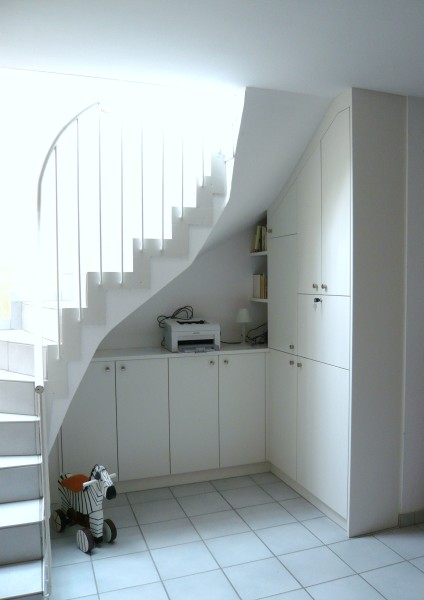 Kleines Homeoffice unter der Treppe, Bücherregal mit Schubladen grifflos