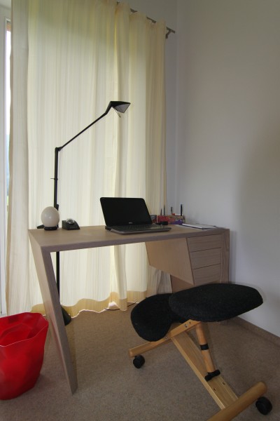 Schreibtisch mit vielen schrägen Oberflächen, weiß gewachste Eiche